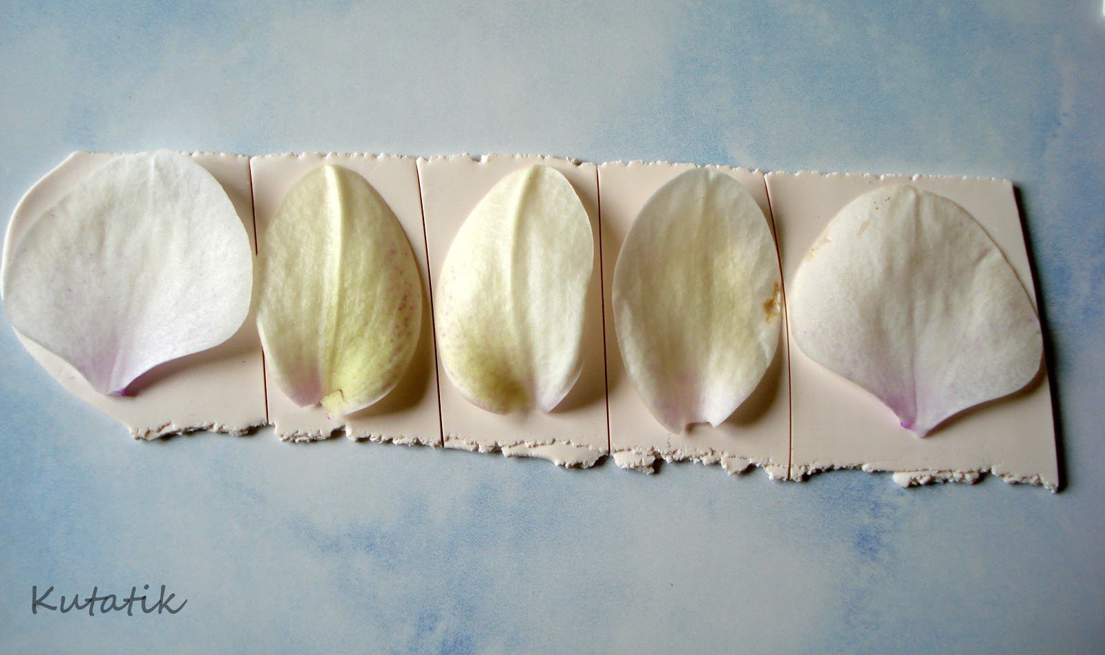теперь по очереди каждый лепесток прокатываем акриловым роликом или просто аккуратненько пальчиками по всей площади лепесток вдавливаем в ПГ и начинаем лезвием по контуру вырезать лепесток
