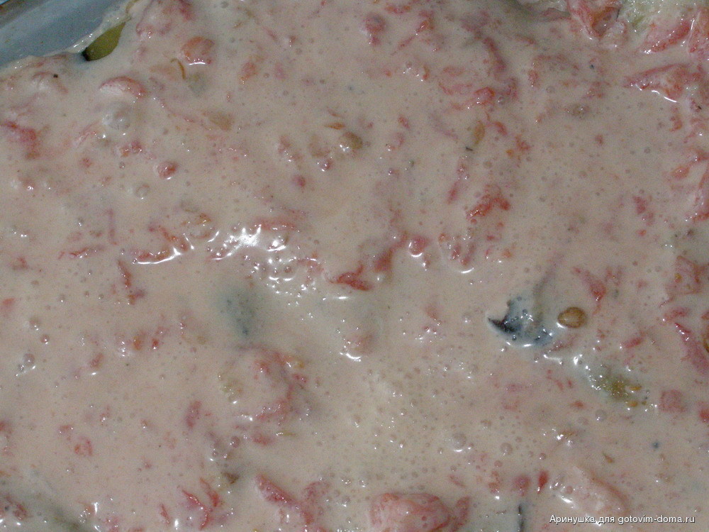 Приготовить соус: помидоры измельчить с чесноком,добавить сметану,поперчить,посолить.Соусом залить рулетики и запекать в духовке 30 мин при 180 *