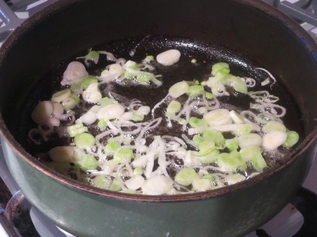 Пока замешивается тесто, делаем начинку. Белые части зеленого лука (или весь репчатый лук) тонко нарезаем. В небольшом сотейнике разогреваем сливочное масло. Обжариваем на нем на среднем огне лук, часто помешивая, до легкого золотистого цвета, минут 7.