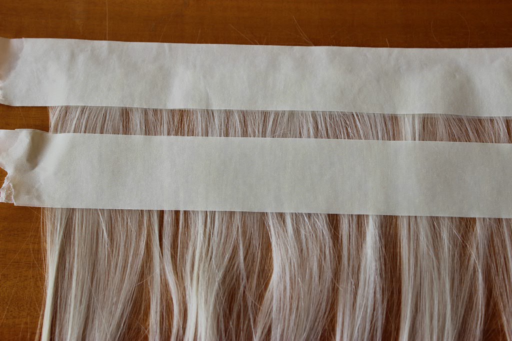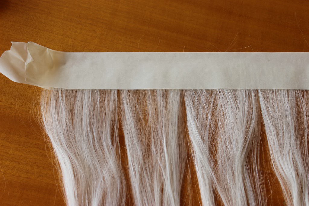 Снимаем скотч (в отличие от обычного скотча, малярный приклеивается не сильно, но хорошо держит пряди). Вместе со скотчем удаляются не пришитые волоски. Для большей прочности шов можно укрепить акриловым лаком(проверено и выбрано опытным путем)))