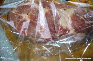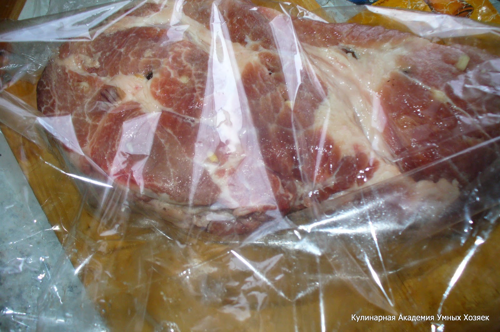 Отправьте нашу замаринованную буженину в духовку, разогретую до 180 градусов, и запекайте полтора часа. Кстати, рекомендуется прокалывать пакет для запекания для выхода пара – я не противJ, но в таком случае вы не сможете переворачивать рукав с бужениной в процессе запекания.