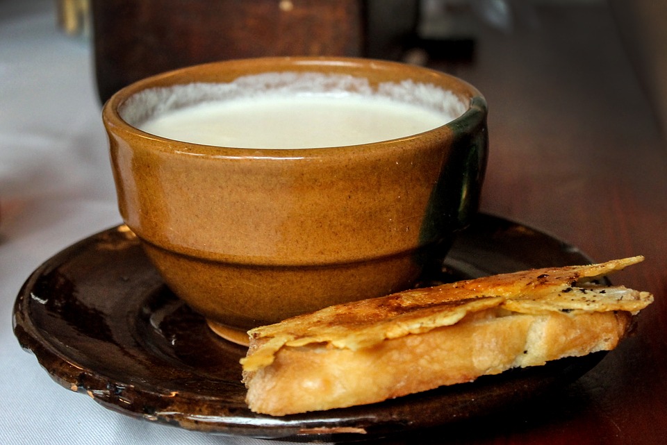 Картофельный суп измельчить блендером, влить горячие сливки и перемешать. При необходимости приправить. Подать на стол с подсушенным хлебом и беконом.