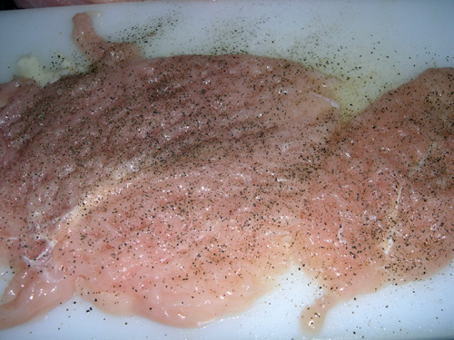 Филе помыть. Отбить с двух сторон, накрывая пищевой плёнкой, чтобы мясо не разбрызгивалось по столу.