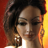 В случае Байкерши, волосы изготовляются из лоскутка черного бархата, имитирующего очень короткую стрижку, а для вживления в кукольную головку длинных волос достаточно глубоко прорезать воск, вставить в эти разрезы пряди, а затем немного прижать - воск надежно удержит волосы.