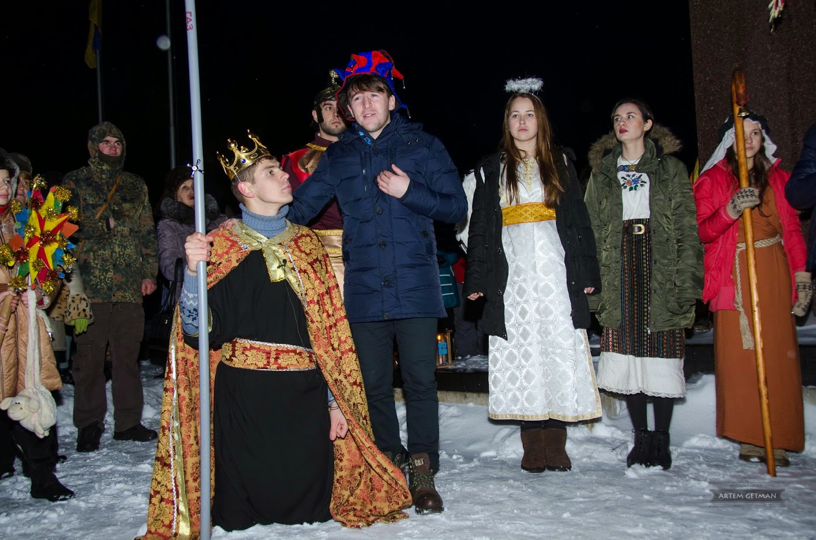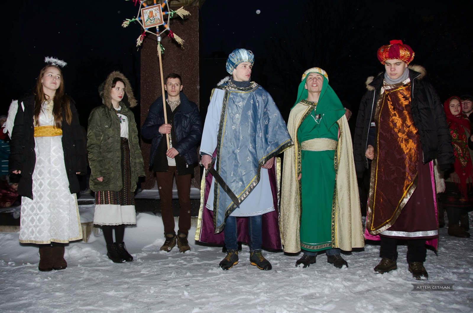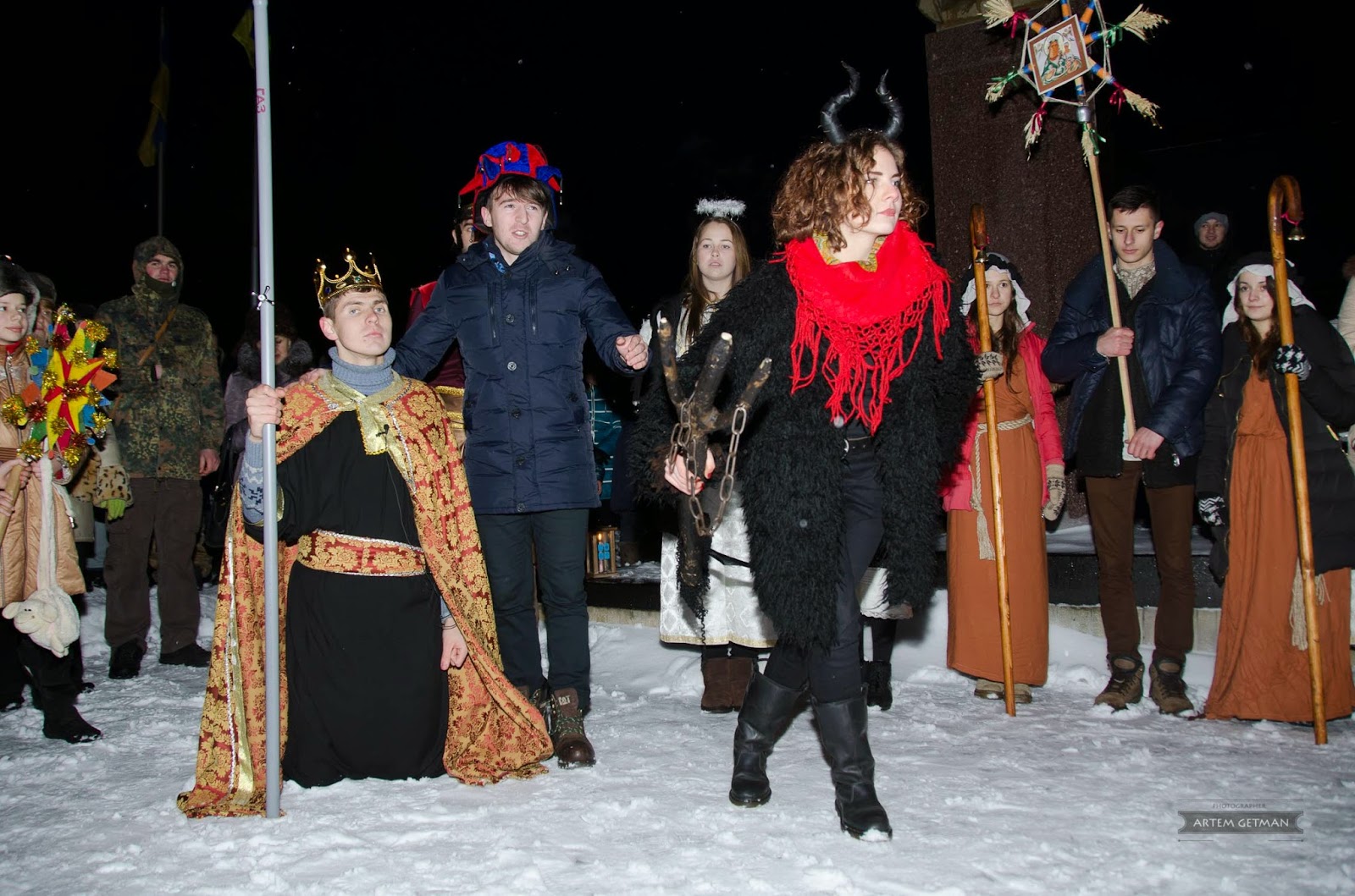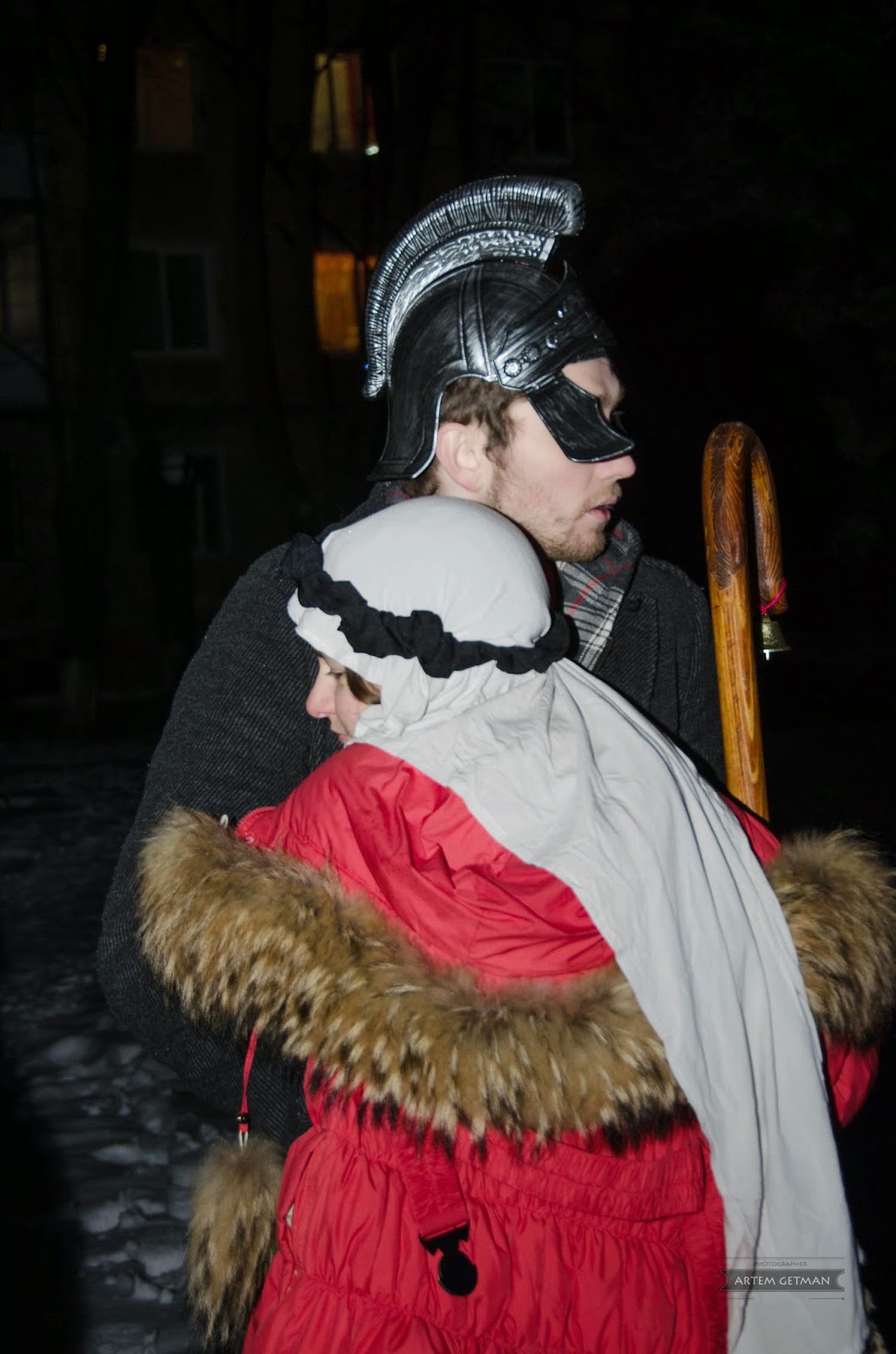 Вот опять посланцы "города Льва" на том же месте, в тот же час. Тема сегодняшнего выступления - традиционный западноукраинский рождественский вертеп, исполнять который традиционно приходят в гости. Сюжет с ряжеными и неизменной Вифлеемской звездой над головами испокон веку кочует по открыткам. Но содержание любительского мини-спектакля для нас, советских воспитанников, при этом остается за кадром. Здесь можно посмотреть, как это выглядит вживую.