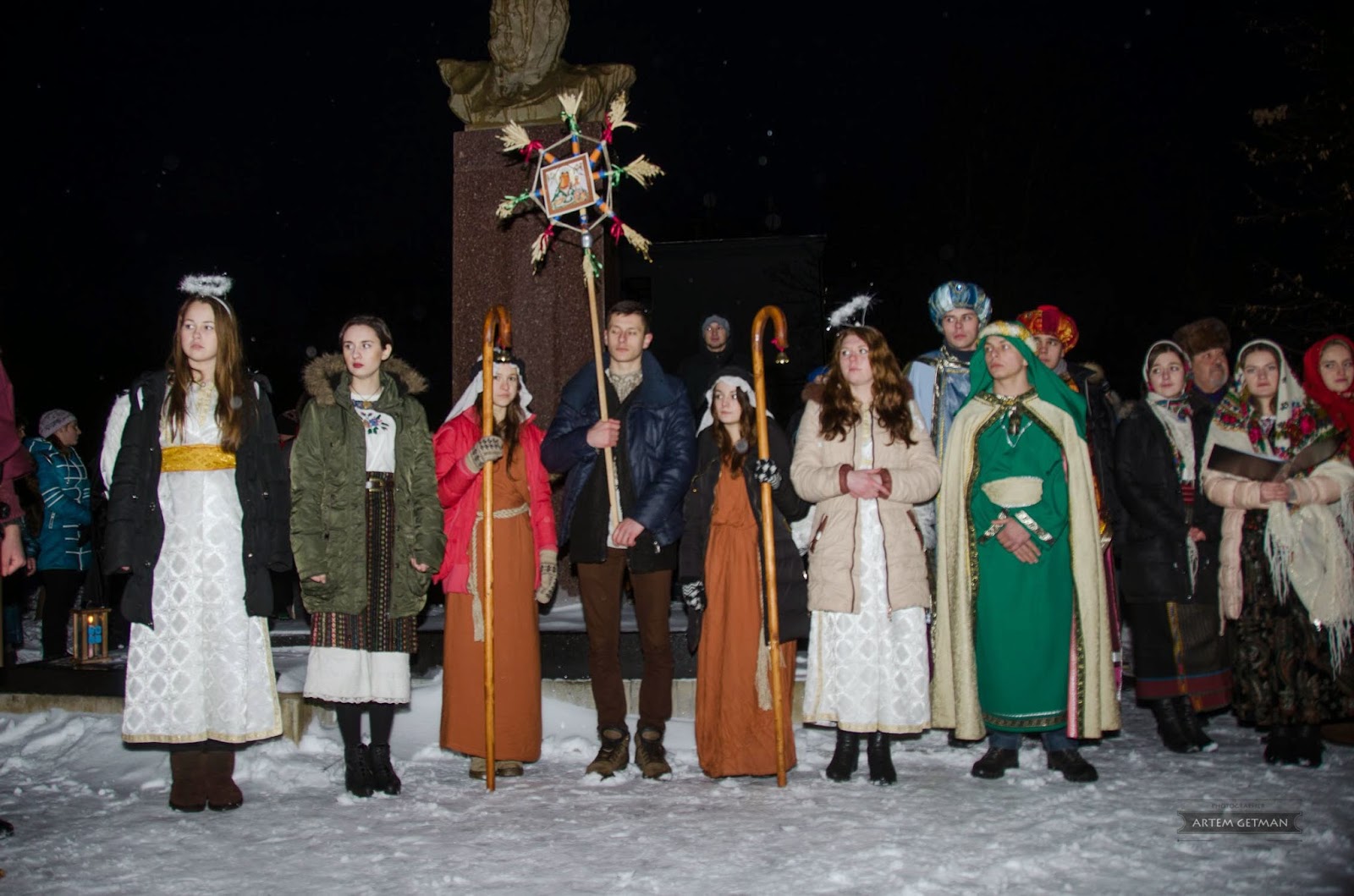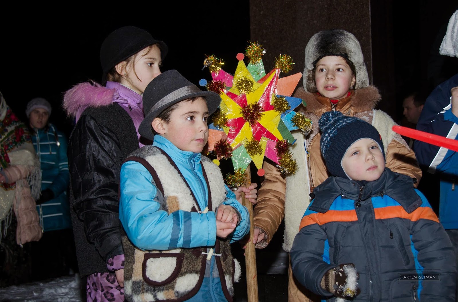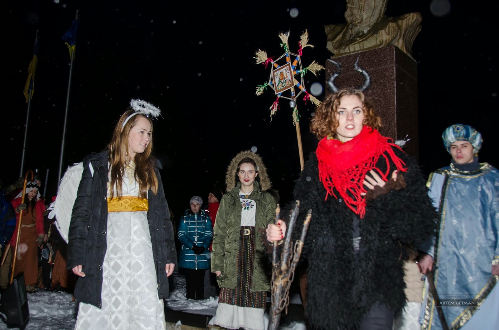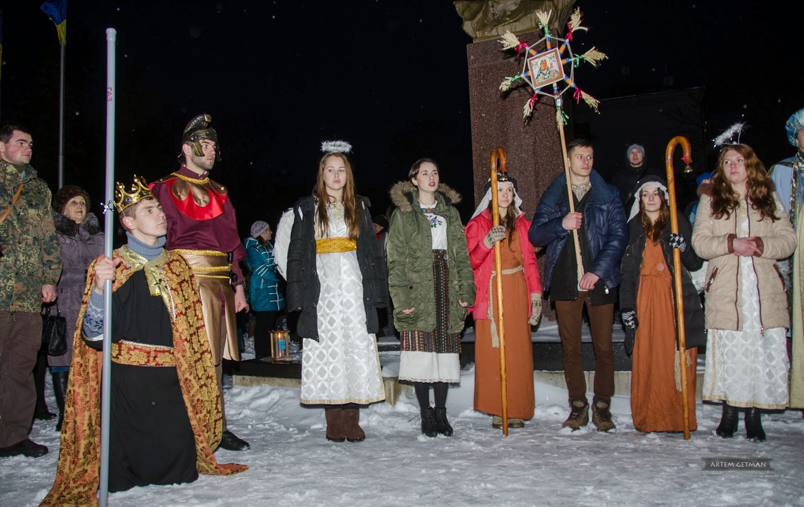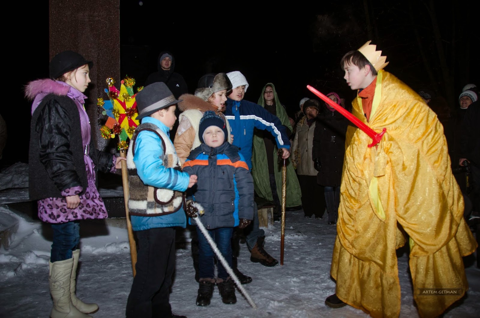 Вот опять посланцы "города Льва" на том же месте, в тот же час. Тема сегодняшнего выступления - традиционный западноукраинский рождественский вертеп, исполнять который традиционно приходят в гости. Сюжет с ряжеными и неизменной Вифлеемской звездой над головами испокон веку кочует по открыткам. Но содержание любительского мини-спектакля для нас, советских воспитанников, при этом остается за кадром. Здесь можно посмотреть, как это выглядит вживую.