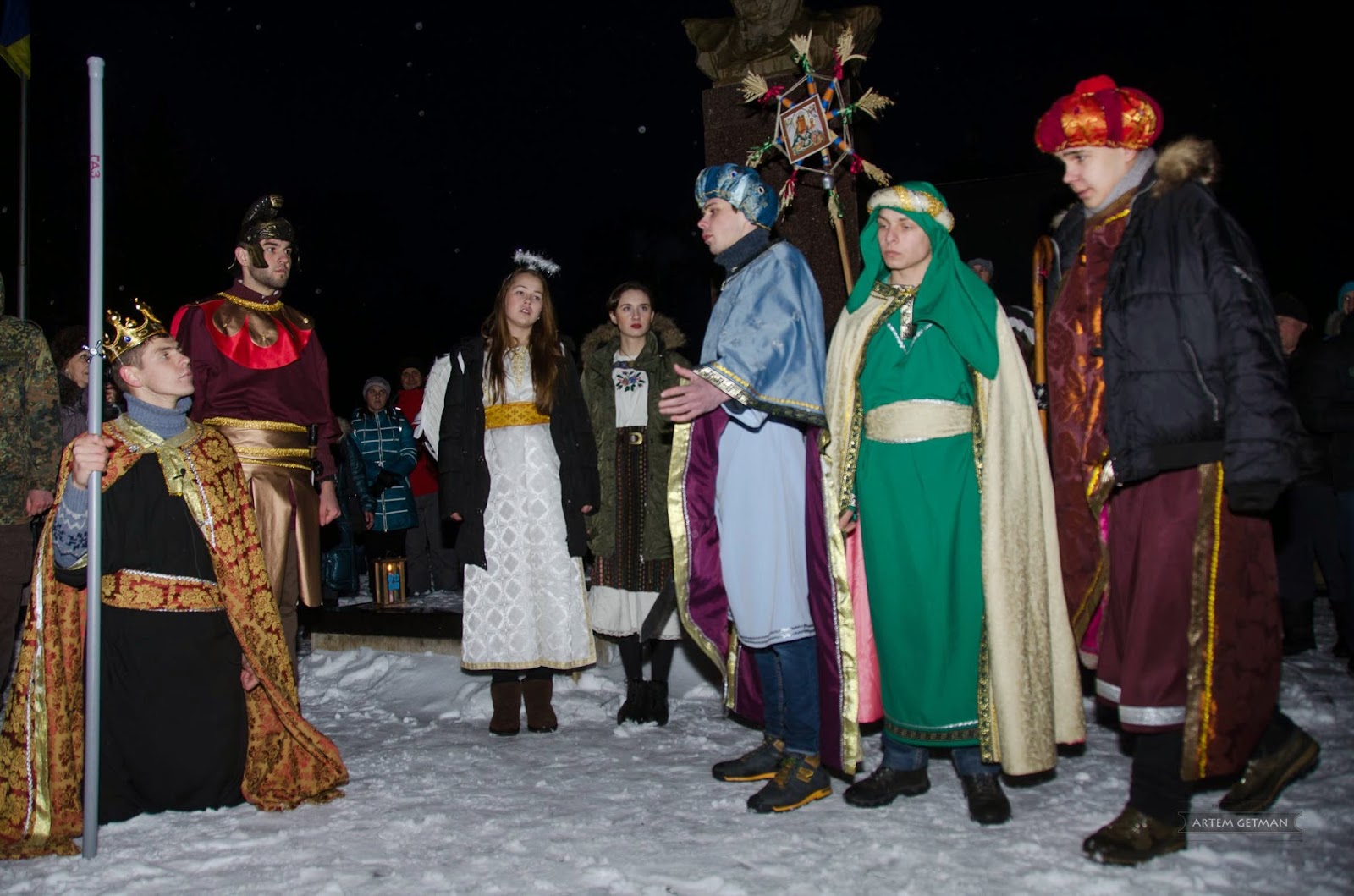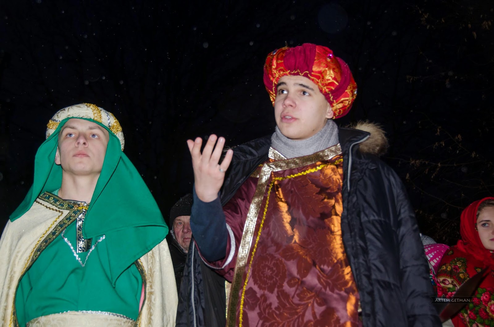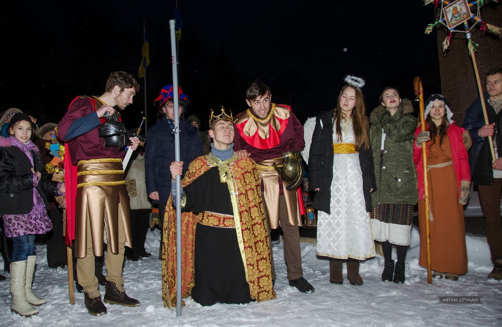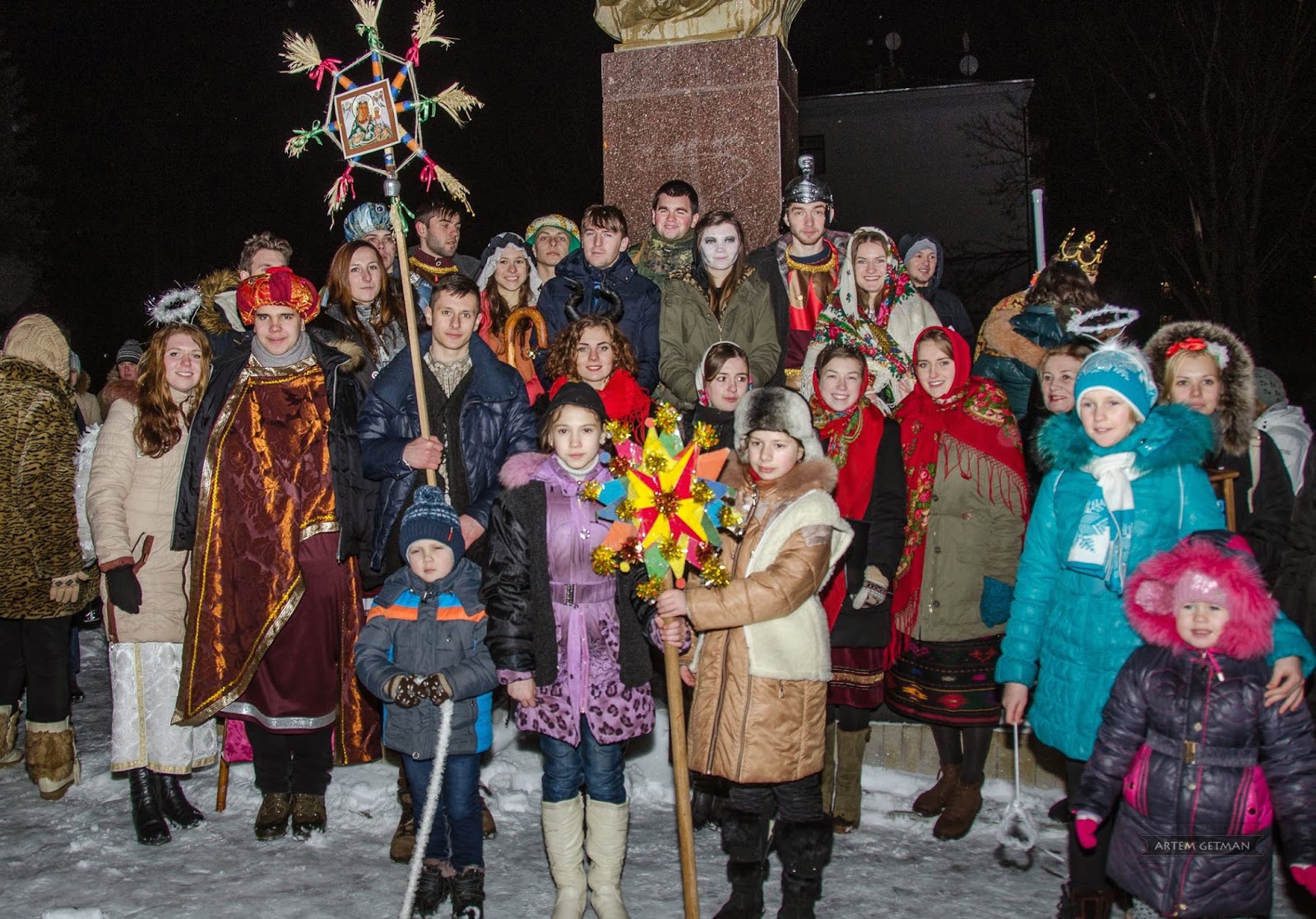 Вот опять посланцы "города Льва" на том же месте, в тот же час. Тема сегодняшнего выступления - традиционный западноукраинский рождественский вертеп, исполнять который традиционно приходят в гости. Сюжет с ряжеными и неизменной Вифлеемской звездой над головами испокон веку кочует по открыткам. Но содержание любительского мини-спектакля для нас, советских воспитанников, при этом остается за кадром. Здесь можно посмотреть, как это выглядит вживую.
