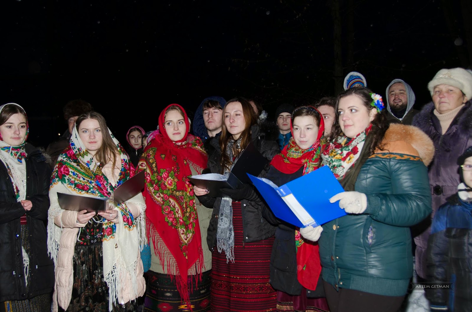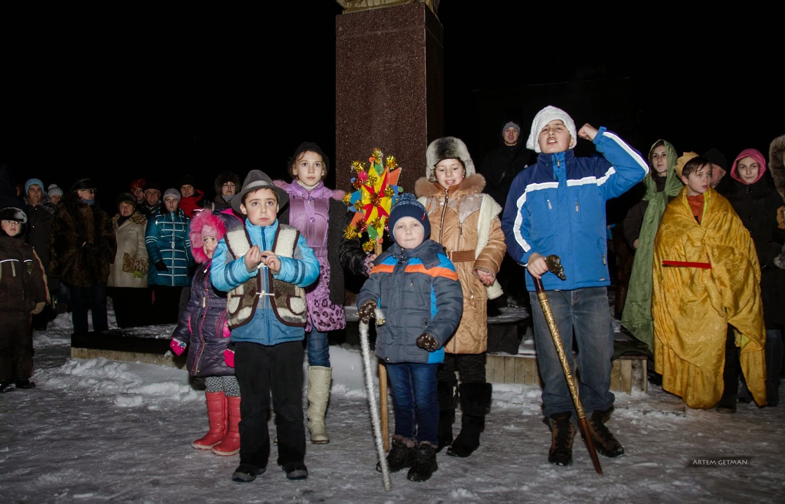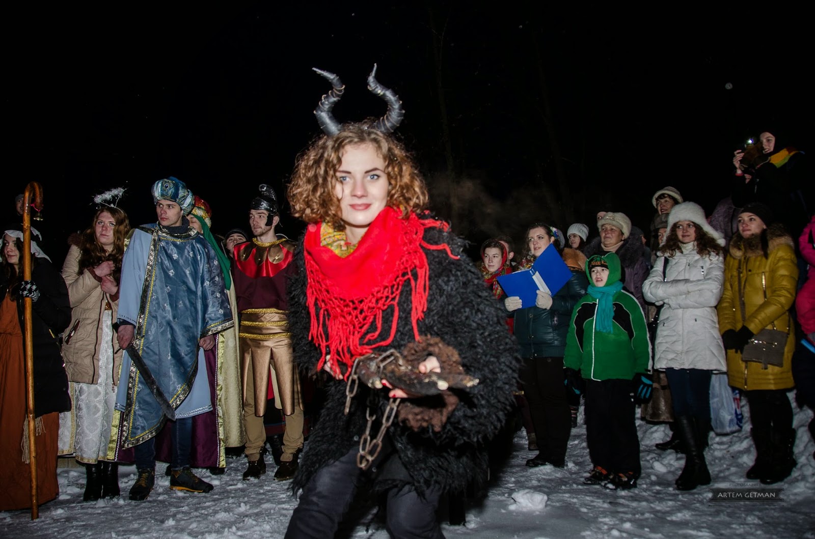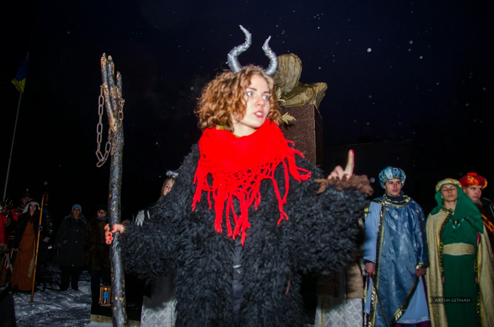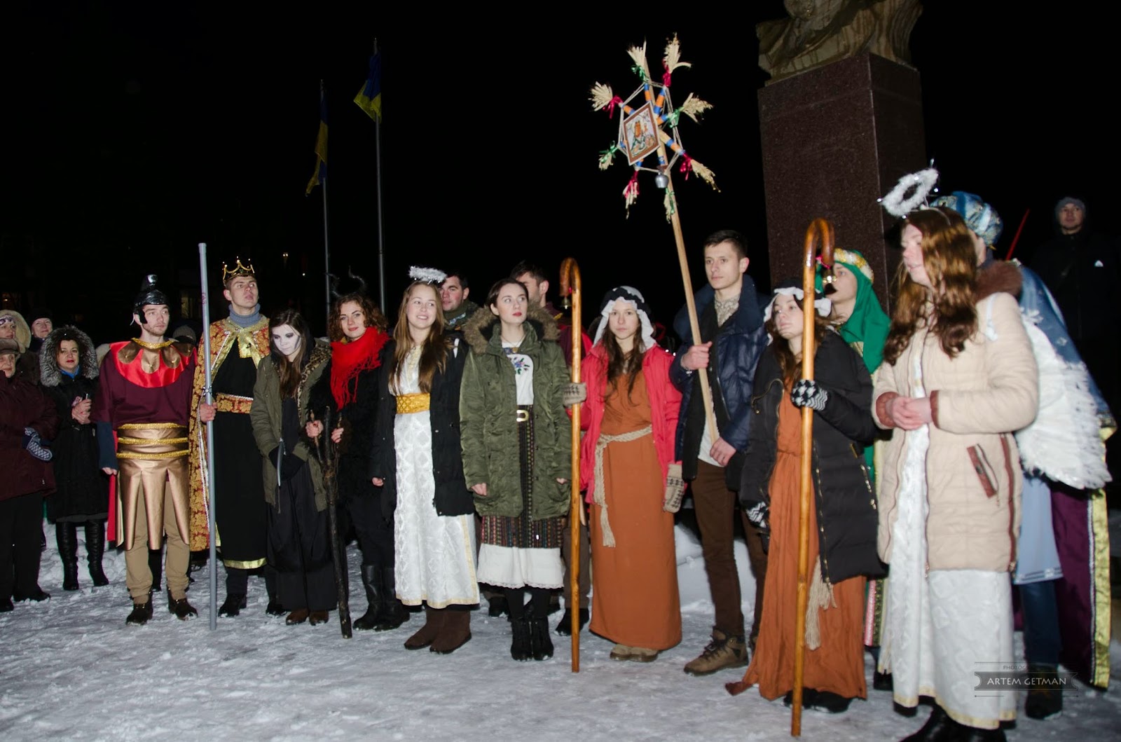 Вот опять посланцы "города Льва" на том же месте, в тот же час. Тема сегодняшнего выступления - традиционный западноукраинский рождественский вертеп, исполнять который традиционно приходят в гости. Сюжет с ряжеными и неизменной Вифлеемской звездой над головами испокон веку кочует по открыткам. Но содержание любительского мини-спектакля для нас, советских воспитанников, при этом остается за кадром. Здесь можно посмотреть, как это выглядит вживую.