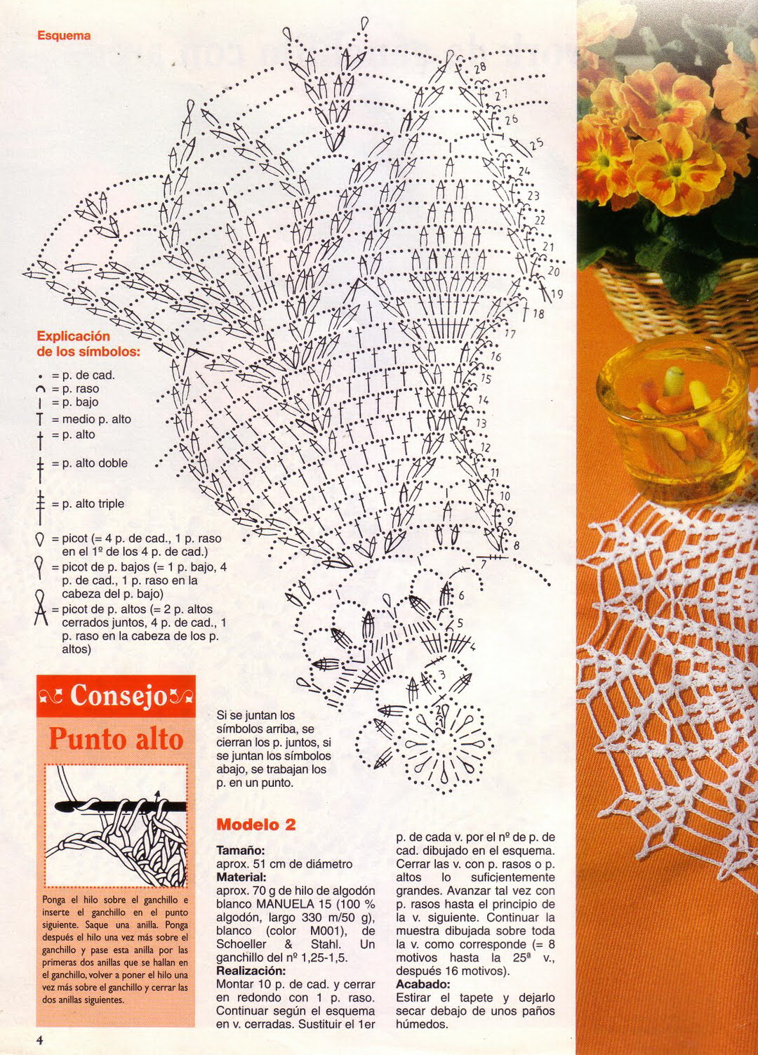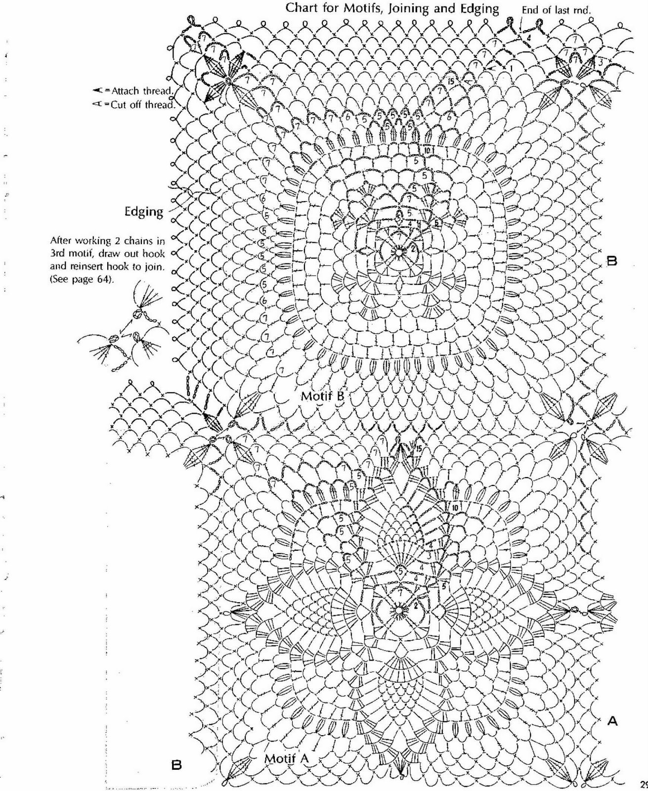 [показать]Схема этого мотива с "ананасом" маленькая, но читаемая. По этой схеме можно связать как отдельную салфеточку, подстаканник, так и собрать большой плед или скатерть/дорожку из таких мотивов.