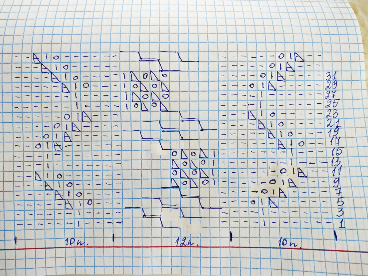 По условным обозначениям: прямоугольный треугольник - это две вместе лицевой петлей, а такой же треугольник с чертой внутри - это две вместе изнаночной. Пустая клетка и вертикальная черта - лицевая петля. Горизонтальная черта - изнаночная. Остальные обозначения, думаю, не требуют объяснений.