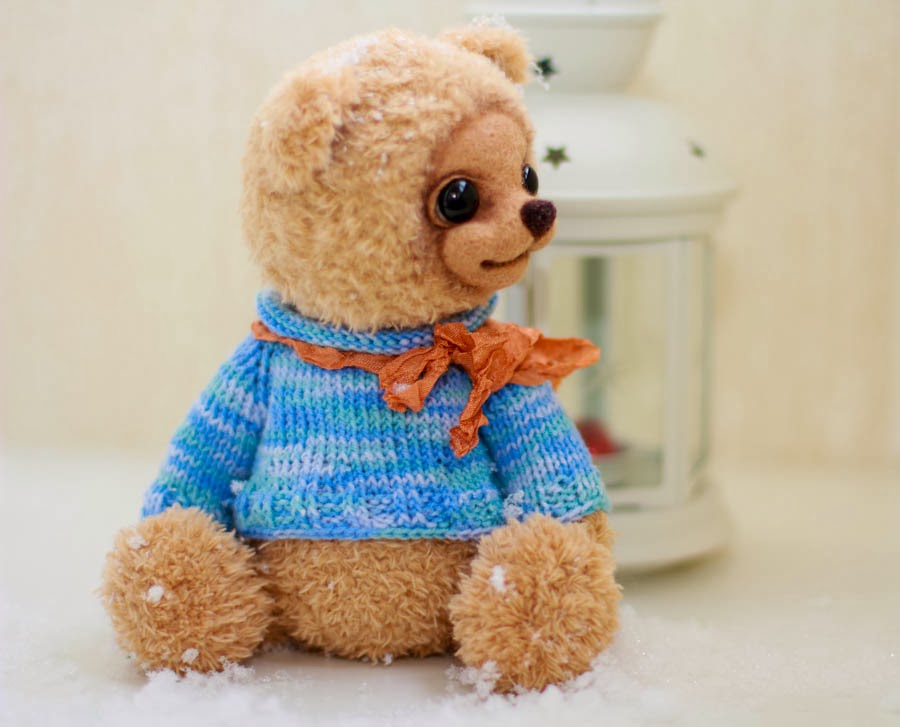 Ростом 22 см. Не стоит, сидит уверенно. Материалы: фактурная пряжа, холлофайбер, шплинты, сухое валяние, тонировка.