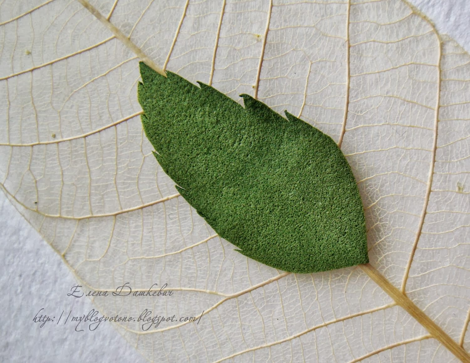 Можно создать и фактуру листика, например с помощью молд. Но у меня их нет и я воспользовалась скелетированным листиком. Нагреваем утюг до средних температур, ненадолго прикладываем листик к утюгу,