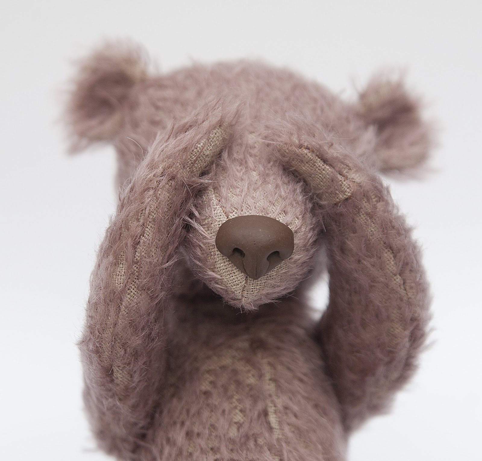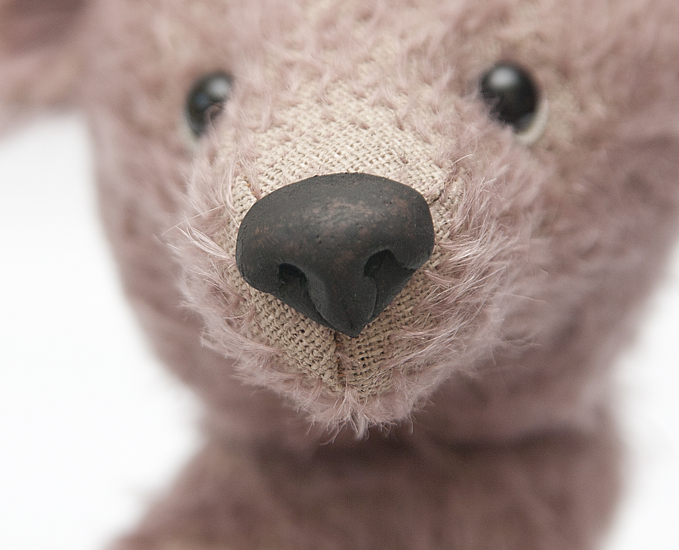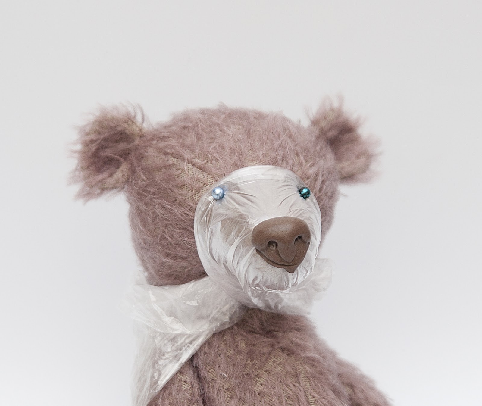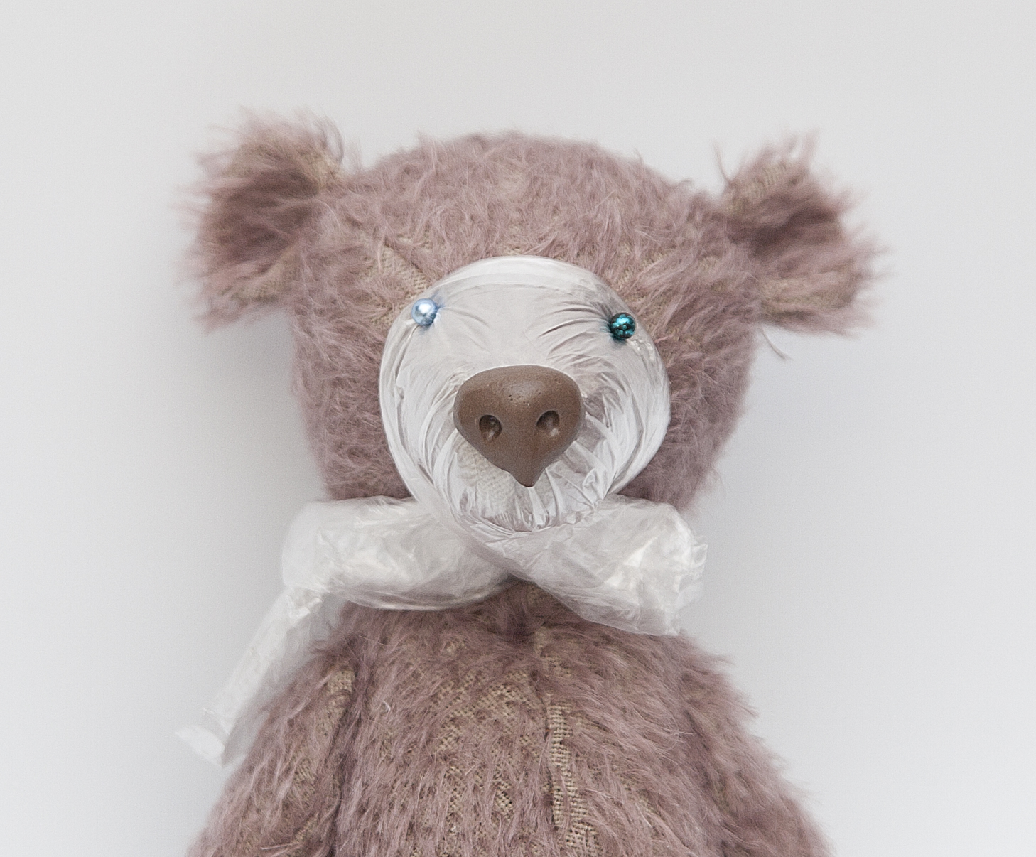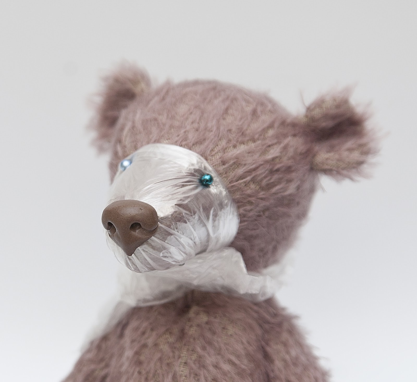 1. Плотно обертываем нос медведя пленкой, фиксируем булавками.