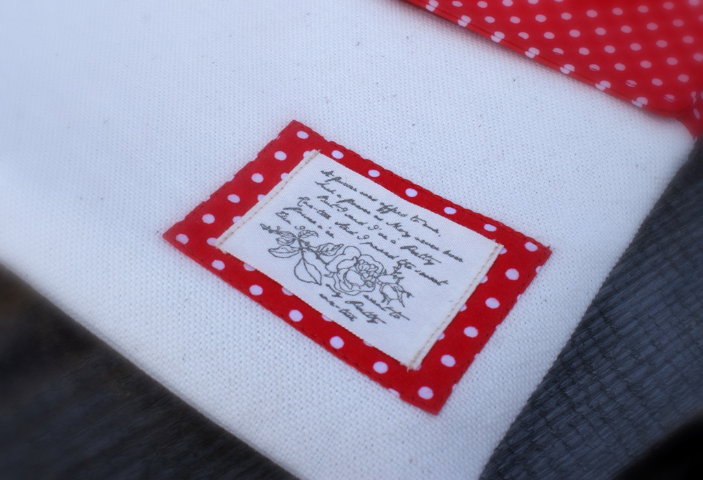 Украсила ярлычком с розой. Такие ленты с ярлычками я недавно получила из Китая, заказывала на Таобао. Счастлива до безумия, теперь буду их везде пришивать :)))А сама идея с нашивками есть в нескольких популярных рукодельных блогах, вы их все знаете.
