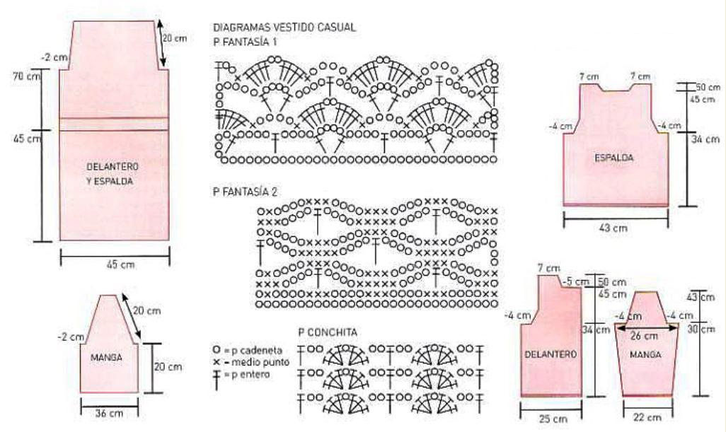 Espalda: urda una cadeneta de 43 cm y teja la 1a corr en p entero, cambie a p según diagrama de p hojas. A los 34 cm de alto disminuya para sisa cerrando 4 cm a cada lado y luego 1 p en cada corr x 5 veces. Al tener un alto de 45 cm teja sólo sobre 10 cm do cada extremo, disminuyendo levemente hasta completar un alio de 50 cm y 7 cm de ancho de hombro.