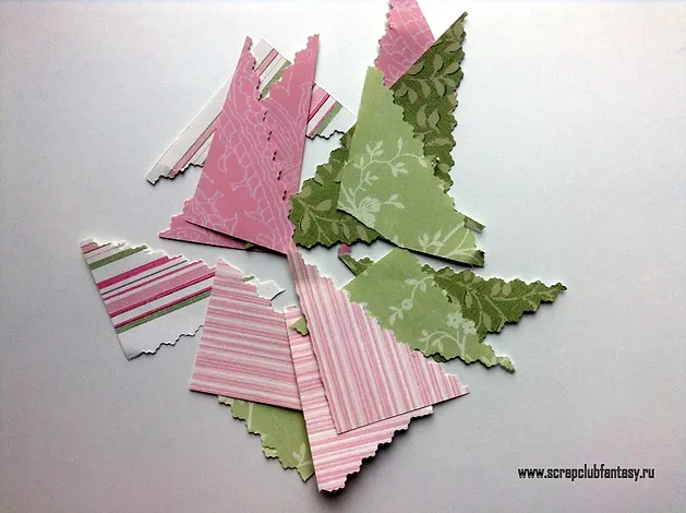 3. Нарезаем треугольнички разного размера, так чтобы по одной стороне всегда был срез фиругными ножницами.