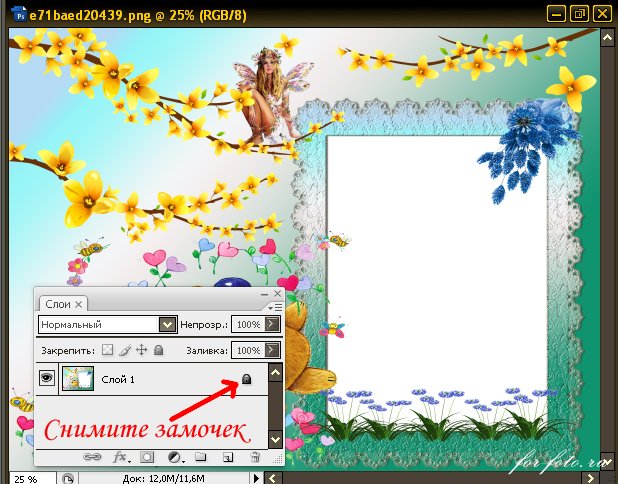 допустим вот такая рамочка , если на слое стоит замочек, кликнете 2 раза лев кноп мыши по слою ,и нажмите ОК, замочек снимется