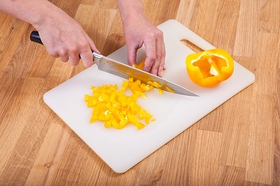 2. Лук очистить и мелко нарезать. Стручок перца вымыть, обсушить, разрезать пополам, вырезать плодоножку с семенами, мякоть нарезать кубиками.