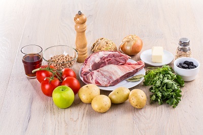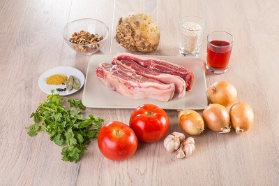 4. Бульон процедить, мясо отделить от кости и нарезать. Снова положить в бульон и довести до кипения. Картофель вымыть, почистить, крупно нарезать, добавить к мясу вместе с нутом и варить 10 мин.