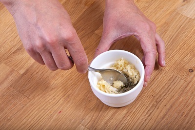 6. Чеснок пропустить через пресс, кинзу мелко нарезать.