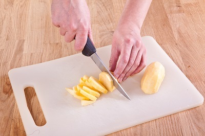 5. Картофель очистить и нарезать кубиками. Бульон довести до кипения, положить картофель и варить 10 мин.