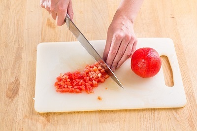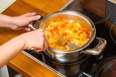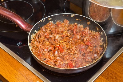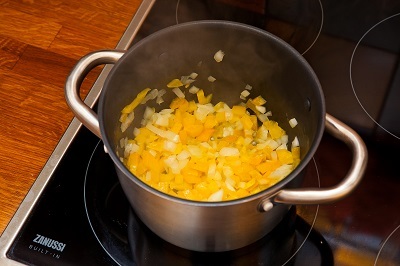 3. В сотейнике разогреть масло и подрумянить подготовленные овощи. Помидоры опустить на 30 с в кипящую воду, затем очистить, мякоть нарезать мелкими кубиками.