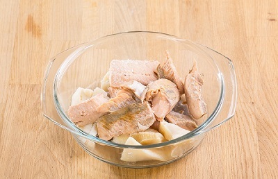1. Рыбу почистить, вымыть, залить 2 л воды, добавить лавровый лист и варить 1 ч. Затем бульон процедить, рыбное филе отделить от кости и сложить в миску.
