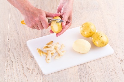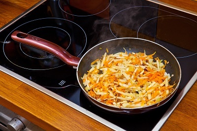 4. Чеснок очистить и пропустить через пресс. Добавить майоран, соль и перемешать. В сотейник добавить картофель и слегка подрумянить.