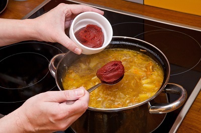 6. Добавить капусту с овощами, томат-пасту и чеснок, пропущенный через пресс. Посолить, поперчить и варить 10 мин.