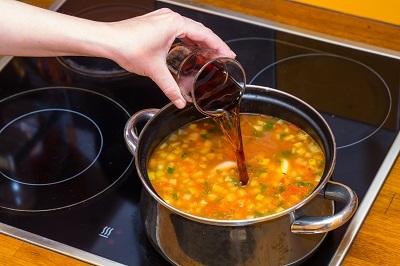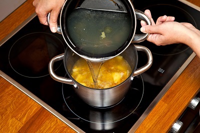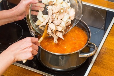 5. Влить бульон, довести до кипения и варить на маленьком огне 10 мин. Чесночную смесь добавить в сотейник, посолить и поперчить по вкусу. Довести до кипения и снять с огня.