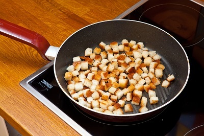 1. Хлеб нарезать кубиками. В сковороде разогреть 3 стол. ложки растительного масла и обжарить кубики хлеба со всех сторон.