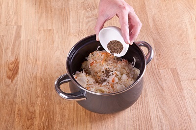 2. Квашеную капусту отжать, выложить в сотейник, добавить тмин, залить горячей водой так, чтобы она лишь покрывала капусту, довести до кипения и тушить на маленьком огне 20 мин.
