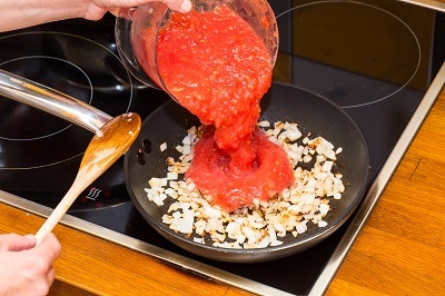 3. Лук очистить и мелко нарезать. В сковороде распустить масло и, помешивая, обжарить лук до золотистого цвета. Помидоры очистить, мякоть измельчить в блендере, добавить к луку и тушить 5 мин.