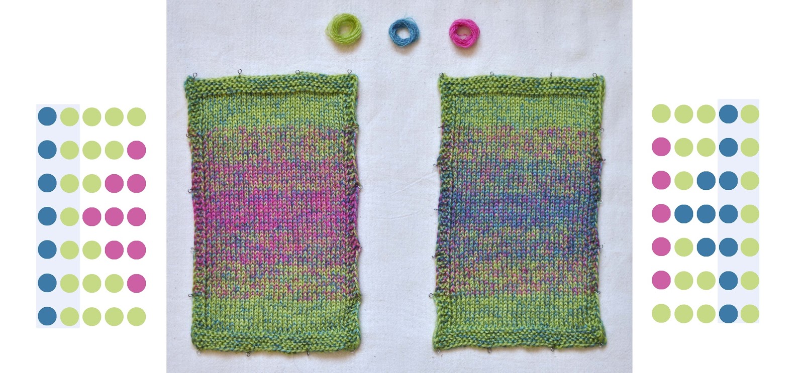 Самый простой способ сделать плавный переход на 3 цветах - трюк, возвращающий нас к принципам работы с двумя цветами. Нужно сделать "осевым" сочетание из двух разноцветных нитей и наращивать/сбавлять другие цвета по этой оси. Смотрим, как это выглядит на образцах: