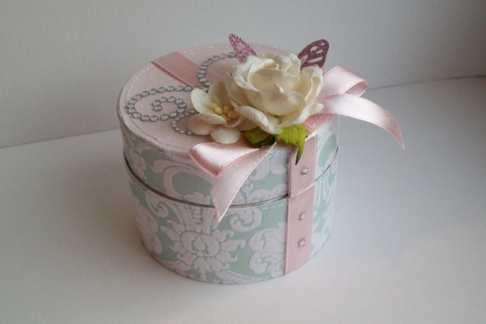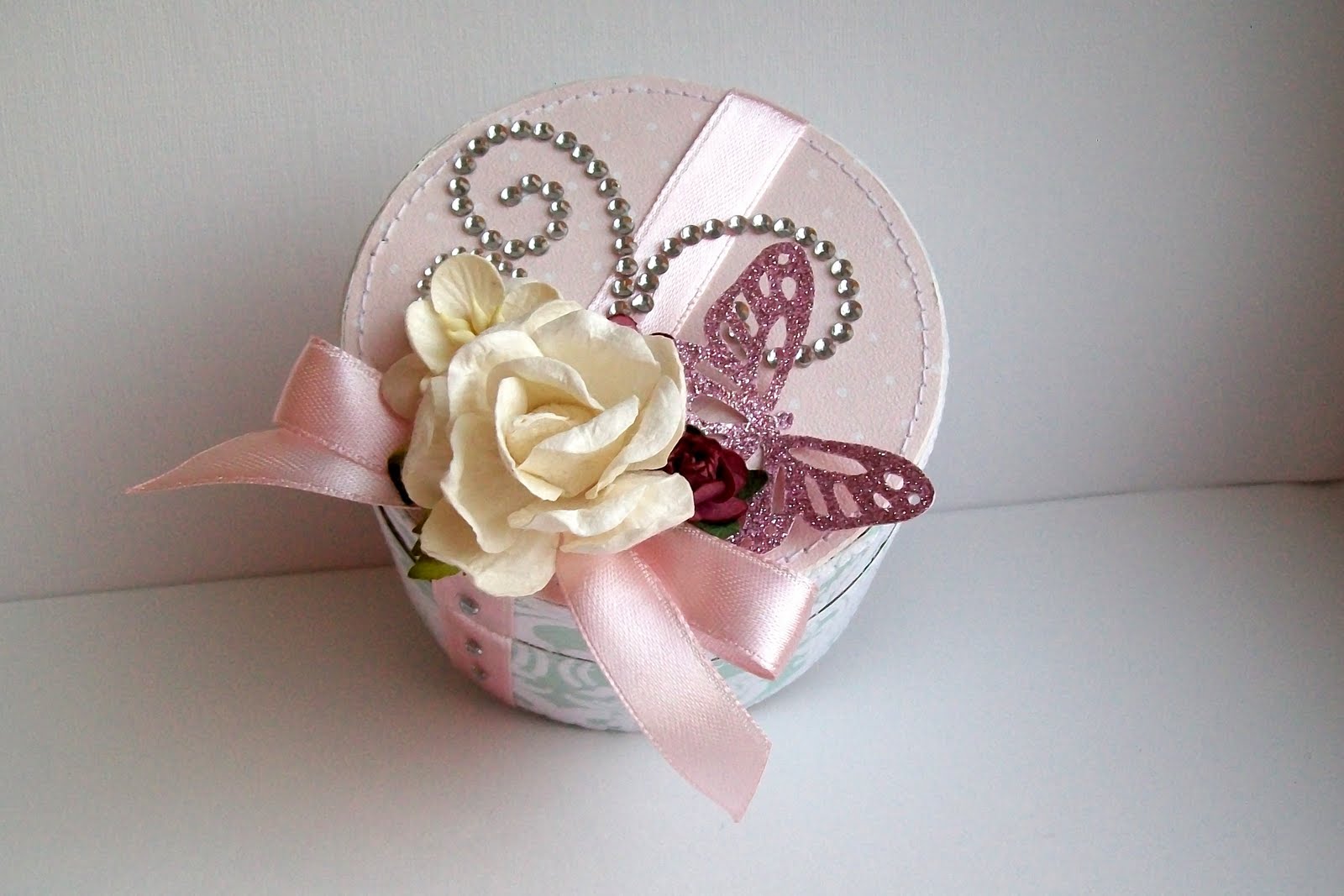 Для этой коробочки я использовала однотонный картон 2х цветов и два вида скрап бумаги. Видимые срезы бабинок закрасила белым акрилом, коробочку украсила бабочкой с глиттером , завитками из страз, цветами и атласной лентой: