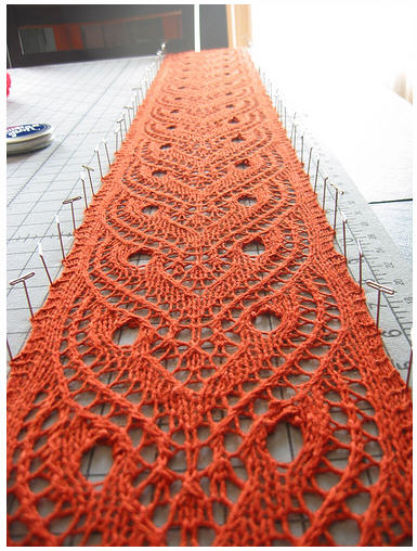 Сборка: Спрятать концы нитей. Замочить шарф в теплой воде на 20 минут. Замотать в полотенце для удаления избытка воды, расправить на ровной поверхности, придать форму и заколоть булавками. Оставить до полного высыхания.