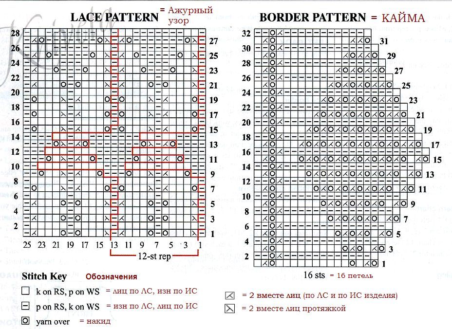 Накидка вяжется одной деталью снизу вверх. Ажурная кайма вяжется отдельно, затем присоединяется к внешнему краю тела накидки, используя закрытие петель тремя спицами.