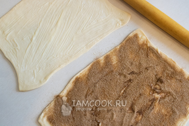 Обильно смажьте обе части теста растопленным сливочным маслом, удобно для этого использовать кондитерскую или обычную кисточку. Один пласт посыпьте сухой смесью из сахара и корицы.