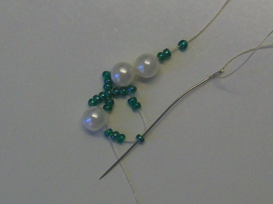 Иглу, со стороны которой набраны бисеринки, пропускаем в среднюю бисеринку между бусинами.