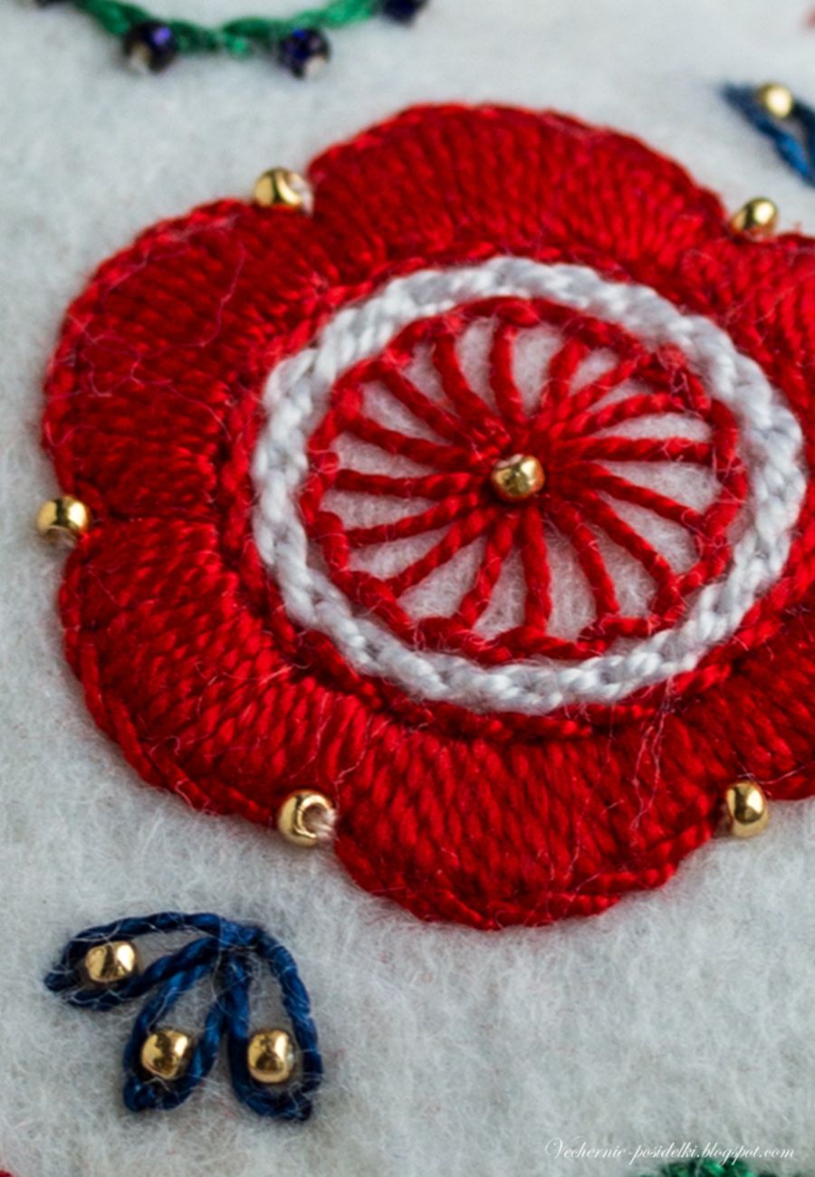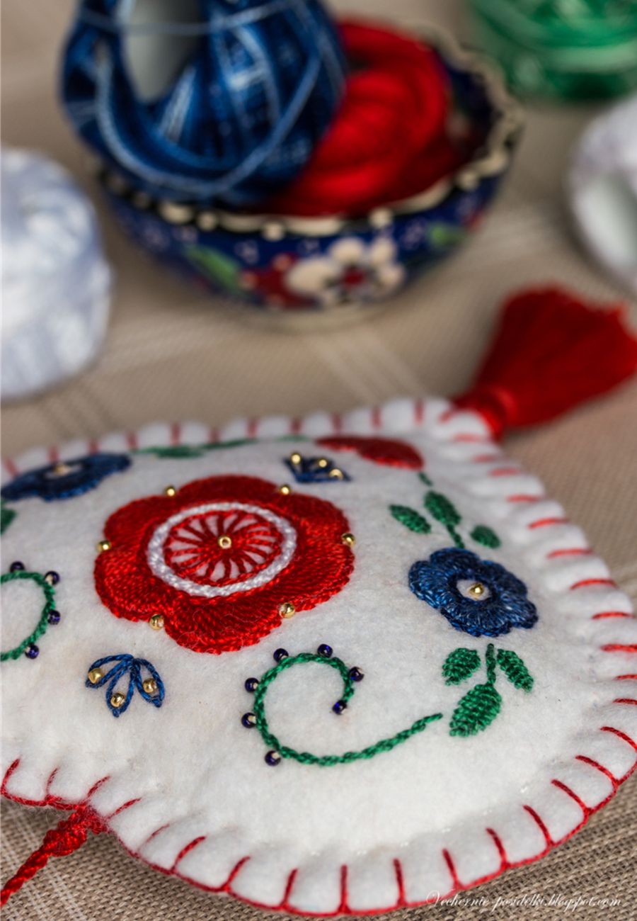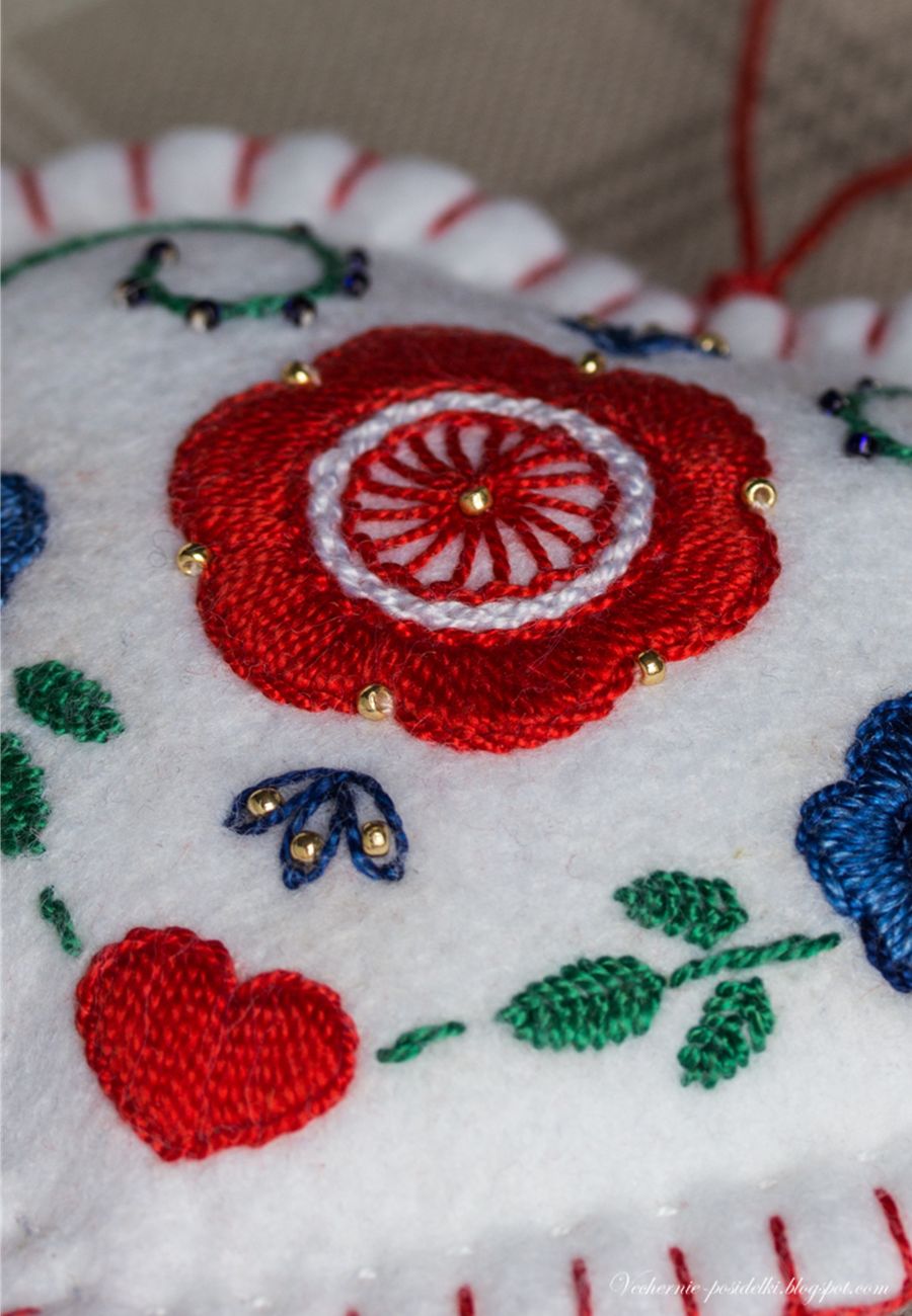 Это сердечко — продолжение прошлогодней фетрово-сердечной серии (как раз можно сравнить как смотрится на фетре обычное мулине и жемчужное). Размер и форма та же, как и фольклорный колорит. Только те были родом из шале, а это, мне кажется, получилось какое-то скандинавское. На ёлке, думаю, будет смотреться здорово.