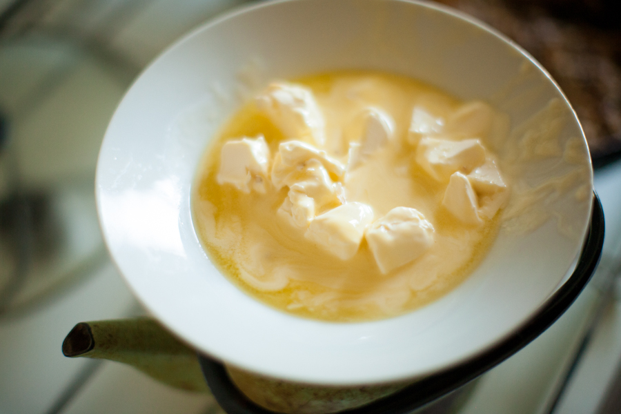 Если рук хватает (в нашем случае их обычно хватает), параллельно с жаркой орехов топим маргарин до жидкого состояния. Удобнее всего делать это в микроволновой печи, поставив таймер примерно на одну минуту, но, так как Петя с Лерой микроволновкой обзаводиться категорически не хотят, мы топили маргарин по-старинке на водяной бане.