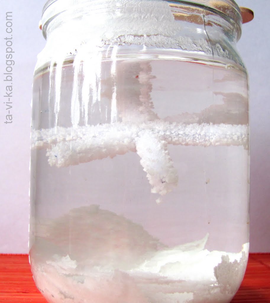 Еще одна поделка с использованием пушистой (синельной) проволоки. Это даже не совсем поделка, а химический опыт. Мы с детьми его делали не раз. И, думаю, не раз еще сделаем:) Заключается он в выращивании кристаллов соли. На этот раз мы делали снежинку на пушистой проволоке. В пол-литровую банку нальем кипяток. Можно и просто горячую воду, но чем горячее, тем быстрее будут образовываться кристаллы. Теперь туда же начнем добавлять соль, тщательно размешивая. Нам надо получить перенасыщенный солевой раствор - т.е. соль надо добавлять до тех пор, пока она не перестанет растворяться в воде. При растворении поваренной соли в воде кажется, что соль полностью исчезает. Но это не так. Частички соли распадаются на мельчайшие кусочки, невидимые глазу. Но при определенных условиях они могут собраться вместе и снова стать видимыми. Да не просто видимыми, а создать причудливые структуры. Когда мы делаем перенасыщенный солевой раствор, растворяя в банке с водой соли больше, чем она может "принять", то излишки соли тут же начинают снова собираться в кристаллы. Очагом роста кристаллов может послужить любое тело в воде: пылинка, нерастворившийся кристаллик той же соли или нитка. Поэтому когда мы опускаем в солевой раствор нашу снежинку, на ней тут же начинают расти кристаллы соли.