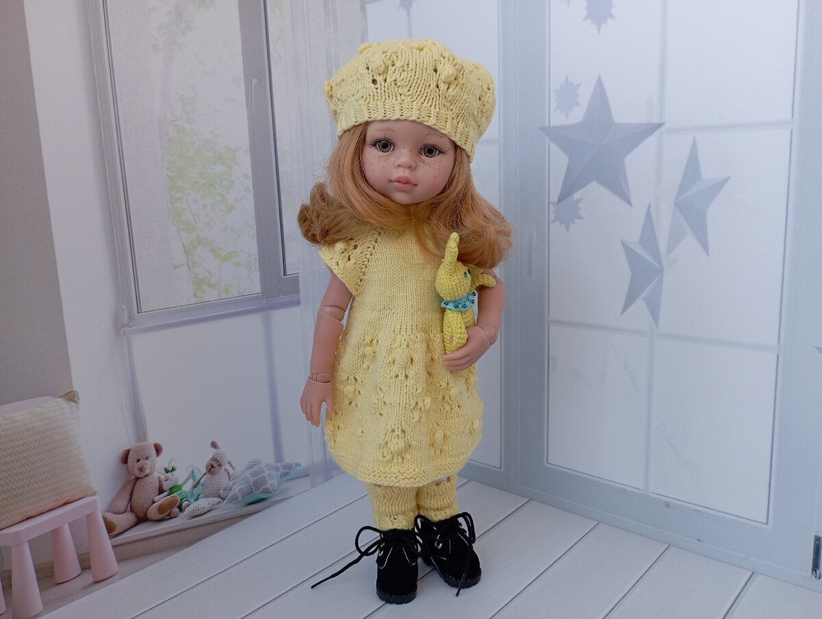 Заканчиваем юбку 6 рядами платочной вязки. Петли закрываем.