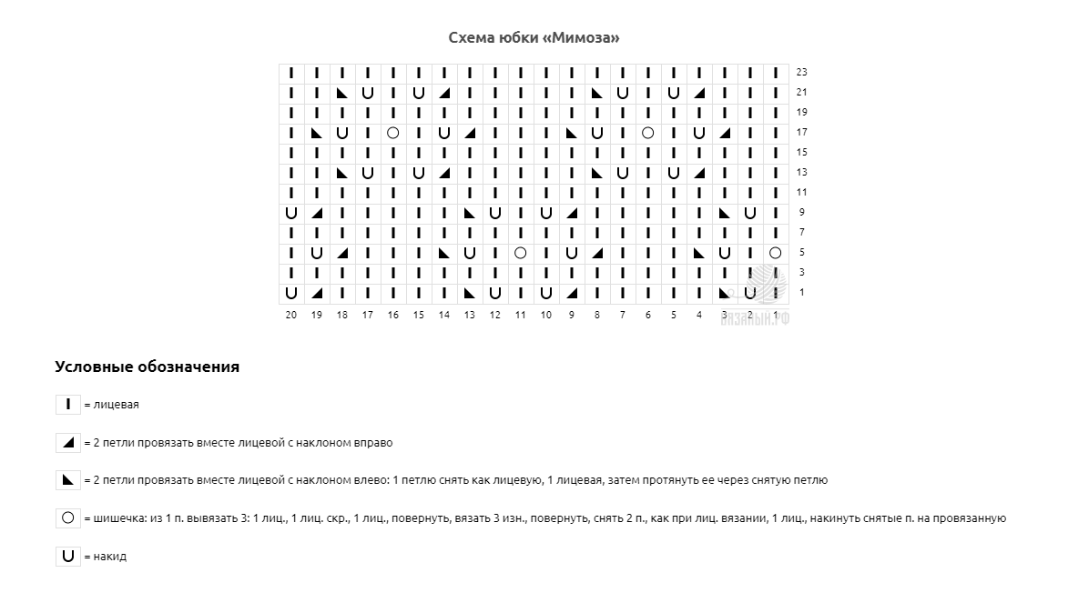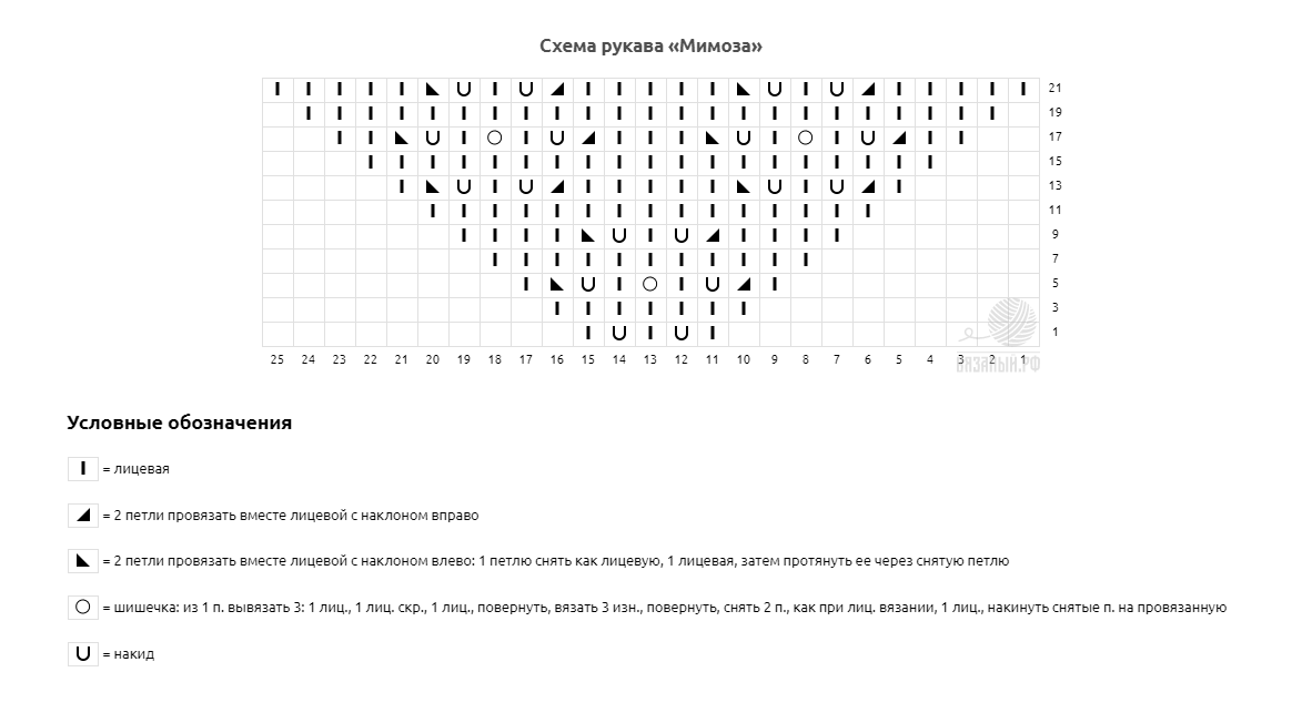 На схеме приведены только лицевые ряды (нечётные). Чётные ряды вяжем лицевыми.