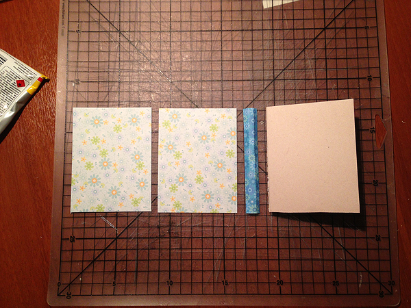 Это даже не столько раскладка, сколько схема крепления :) Берем оставшийся третий лист и разрезаем его на шесть равных частей 4х6 дюйма (10х15 см), клеим на основы такого же размера, далее, отступив по длинной стороне пару сантиметров, бигуем пять из шести будущих страничек.