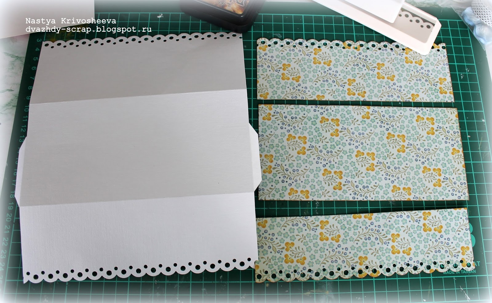 Таким образом, когда вы закрепите бумагу на конверте у вас получится симпатичный белый зазор в 1 мм со всех сторон. Один край кусочков, которые пойдут на клапаны конверта, обрабатываем дыроколом края, тонируем.