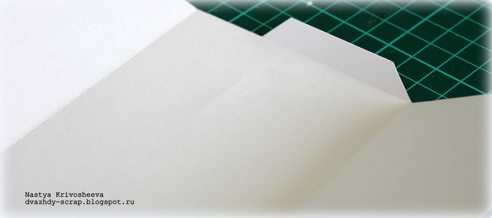Далее с каждого бокового края отмечам по 1 см. Это нам необходимо, чтобы наметить "ушки", которые будут скреплять сам конверт и красиво формироваить карман. Намечаем "ушки" как показано на фото: от верхнего сгиба продлеваем на 3см., от нижнего намечаем сразу. Отререзаем намеченный 1 см. бумаги под углом 45 градусов.