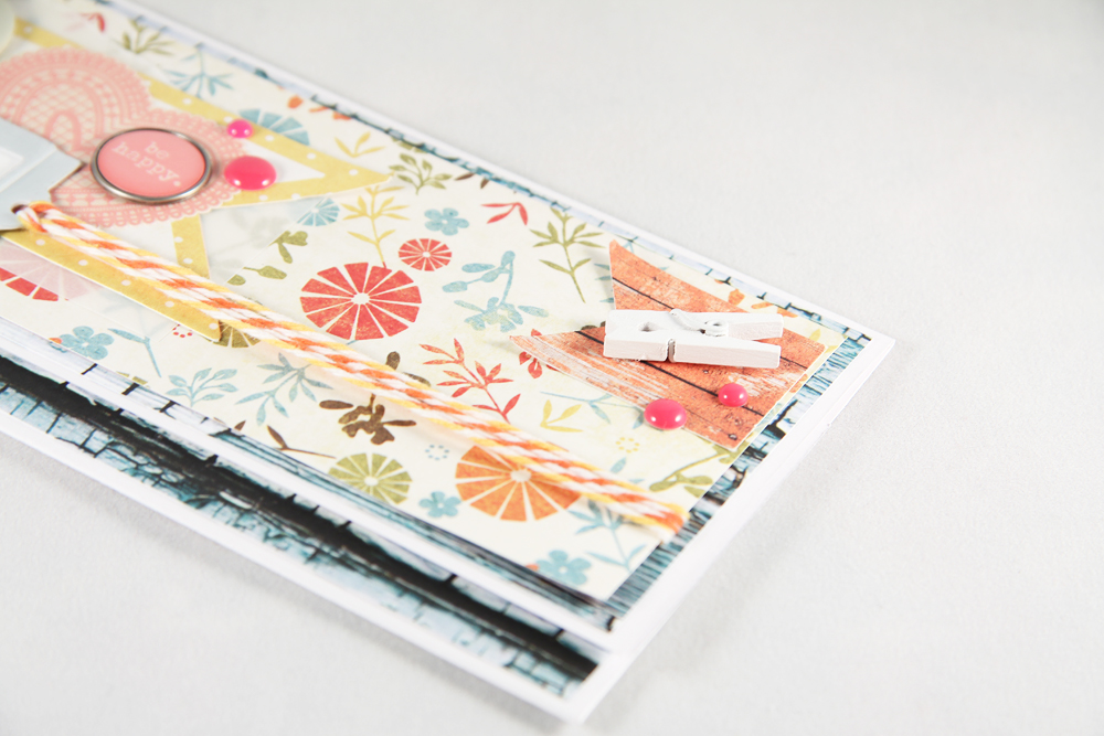 Теперь соберём конверт, но НЕ склеиваем. Крепим на скрепки. Это необходимо, чтобы примерить бумагу и украшательства, наметить композицию и понять, как всё будет выглядеть в итоге. Если мы хотим украсить конверт брадс, скобами, люверсами или машинной строчкой, то лучше это сделать до того, как мы приклеим скрапбумагу.