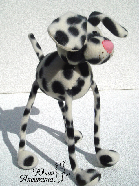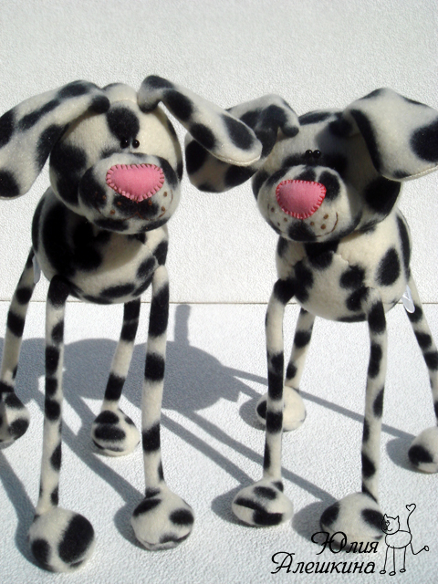Многие постоянные читатели моего блога наверняка заметили мою любовь к длинноногим котам, да и сами, думаю, испытывают к ним нежные чувства))) Так вот на радость своим заказчикам и конечно же вам - дорогим поклонникам моего творчества я решила сделать целую серию длинноножек. Итак, знакомьтесь! Это собачки! Флис был пятнистым, получились своеобразные далматинцы))) Братья, но не близнецы! В процессе конструирования и поиска наиболее оптимальной формы головы получились два пёсика с разными мордочками. Имён я им не давала, хотя условно они были у меня Тобик и Бобик)))