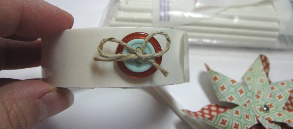 [показать]I added coordinating buttons in a stack and tied with some hemp twine and then plopped it (technical term, ha) right onto my roll or glue dots.